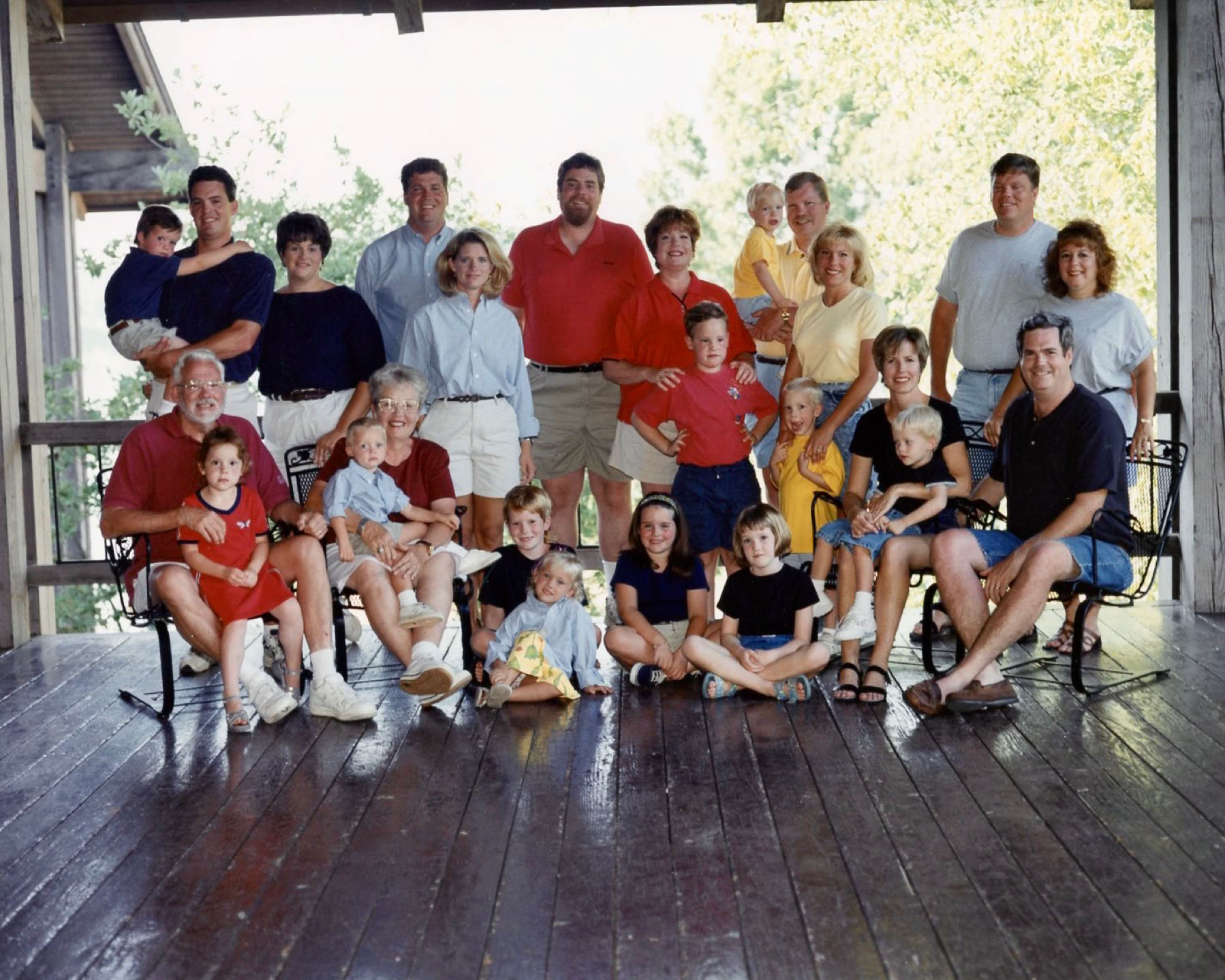 The whole family organized by color: Mom and Dad - Burgundy, Chip and family - Dark Blue, Jeff and family - Yellow, Rebecca and family - Red, Mark and Jackie - Grey, Told and family - Dark Blue and Kurt and family - Light Blue