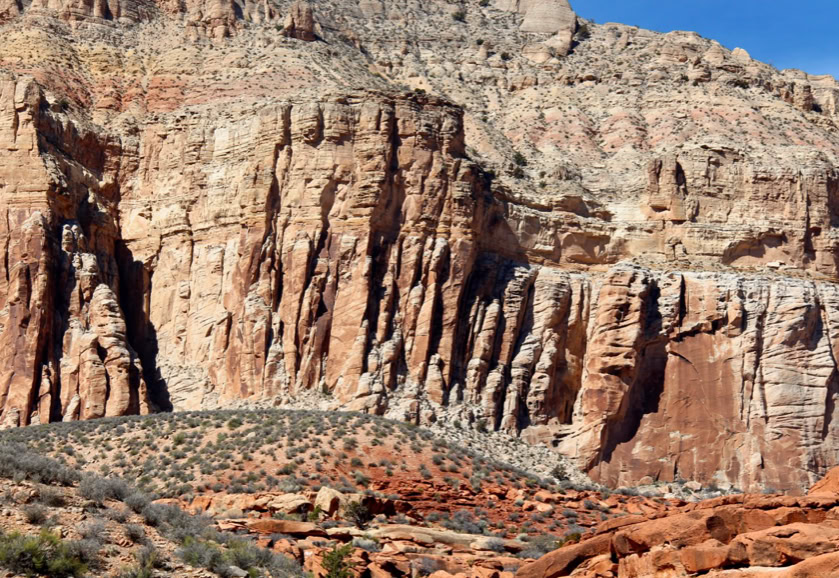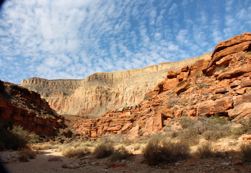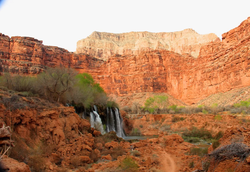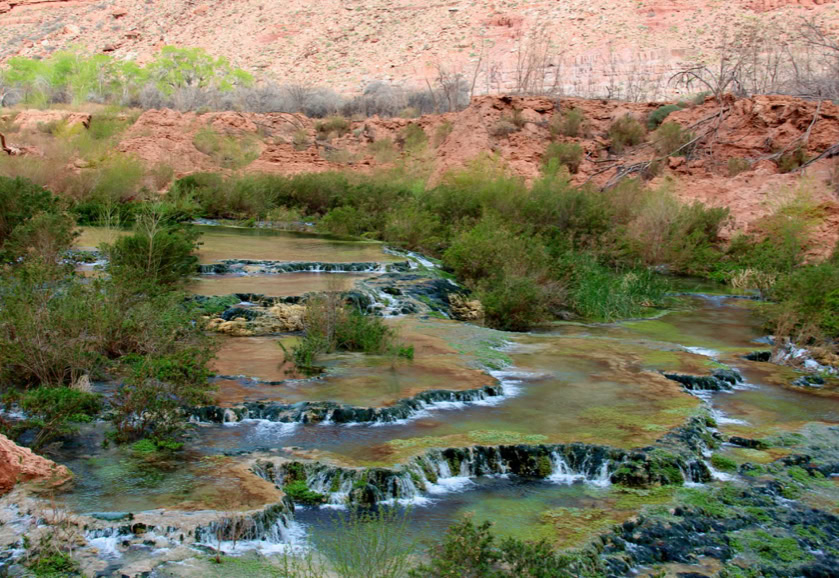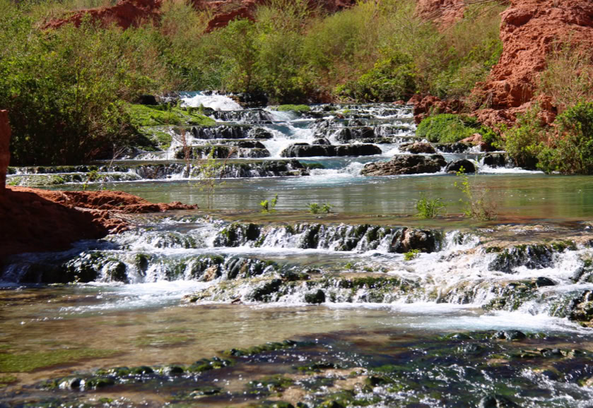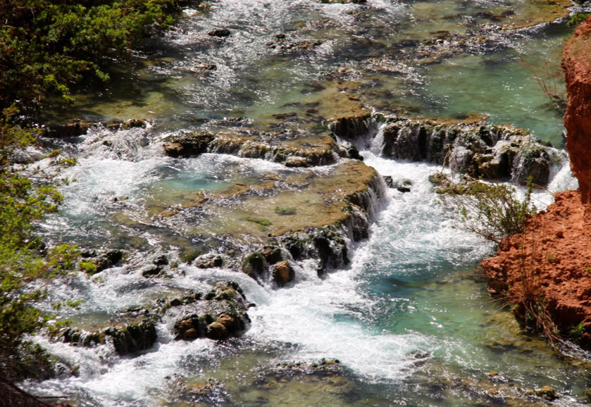The Havasupai Waterfalls are the most dramatic waterfalls in the Grand Canyon. The Grand Canyon’s geologic layers stair step down from the rims to the Colorado River, and the steeper sections create waterfalls. The tallest, steepest geologic layer in the Grand Canyon is the limestone precipice known as the Red Wall, which circles the canyon like a ring on a bathtub. Havasu Creek arises from a spring and flows down canyon. Below the village of Supai it begins plunging over a series of steep drop-offs as it descends through the Red Wall. These drop-offs are what create the Havasupai Waterfalls. Havasupai is roughly translated as “The people of the blue-green waters,” which refers to the beautiful turquoise color of Havasu Creek. The color of the water is the result of having been stored underground – in limestone caverns or aquifers – for as much as 30,000 years. While underground, the water leaches out minerals, primarily calcium and magnesium, from the limestone. These minerals saturate the water and reflect sunlight, making the water a turquoise color. As the water flows over the ground, it deposits these minerals, which create travertine rock formations along the bottom of the creek. As floods come through and alter the stream bed, the travertine is uncovered and produces incredibly unique formations throughout Havasu Canyon.