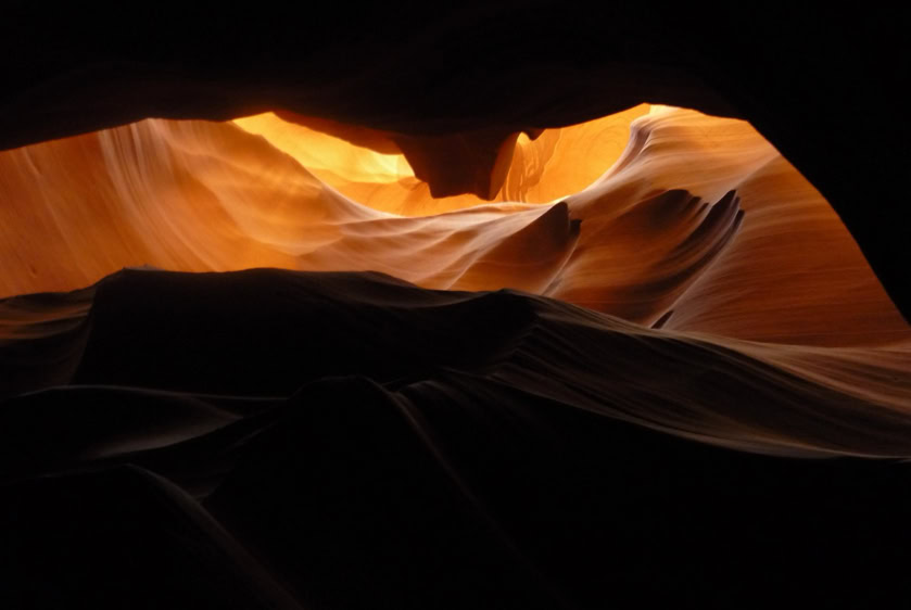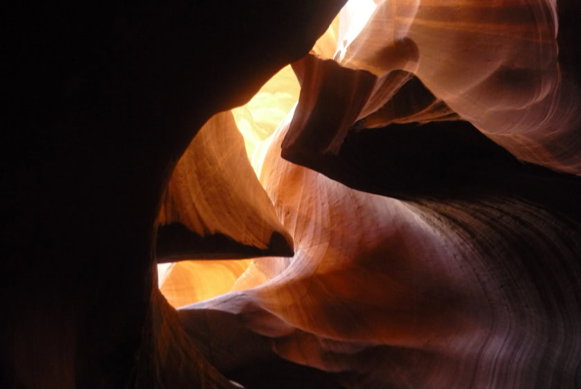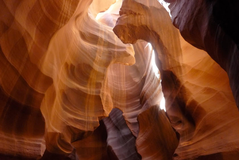Antelope Canyon is located near Page on Navajo Nation land, just outside Glen Canyon National Recreation Area. Antelope is the most visited slot canyon in the Southwest, partly because it is easily accessible and by far the most publicized, and also since it is extremely beautiful, with just the right combination of depth, width, length, rock color and ambient light; many other slot canyons are deeper, narrower or longer, and some have rock that is even more colorful and sculptured, but here conditions are ideal. When approaching upper Antelope Canyon, there is no obvious clue as to its location. The trail seems to end at the base of a red sandstone plateau about 20 yards high, the entrance is a narrow curved slit in the cliffs only a few feet wide. Once inside, the temperature drops as much as 20 degrees as the visitor enters one of the most beautiful of all natural formations. The sunlight filtering down the curved sandstone walls makes magical, constantly changing patterns and shadows in many subtle shades of color. Some sections of the canyon are wide and bright, while others are narrower and more cave-like, with no light reaching the sandy floor. After only 150 yards or so, the canyon becomes suddenly much shallower near the top of the plateau. It may take only 3 or 4 minutes to walk through, but the canyon is well worth trip