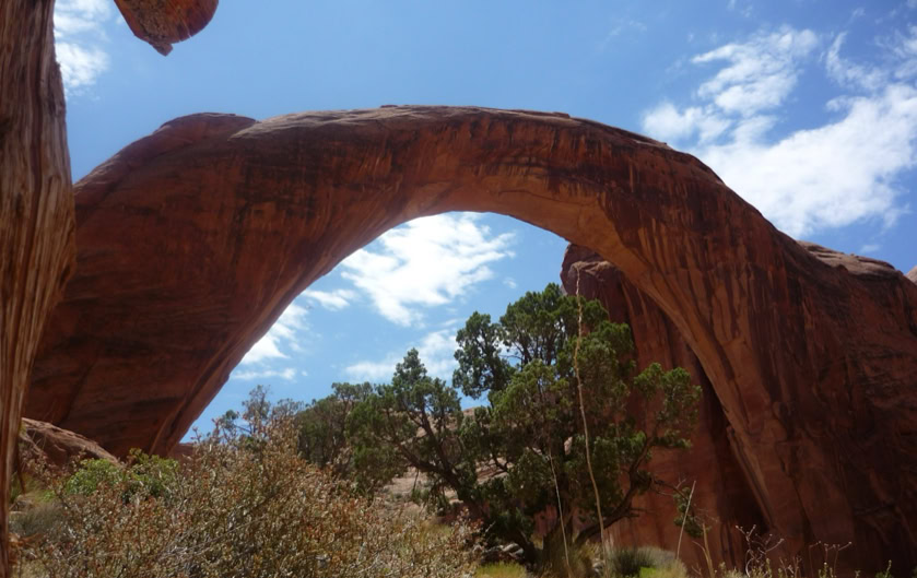 Rainbow Bridge National Monument is administered by Glen Canyon National Recreation Area, southern Utah, United States. Rainbow Bridge is often described as the world's highest natural bridge. Rainbow Bridge is one of the most accessible of the large arches of the world. It can be reached by a two-hour boat ride on Lake Powell from either of two marinas near Page, Arizona, followed by a mile-long walk from the National Park wharf in Bridge Canyon.