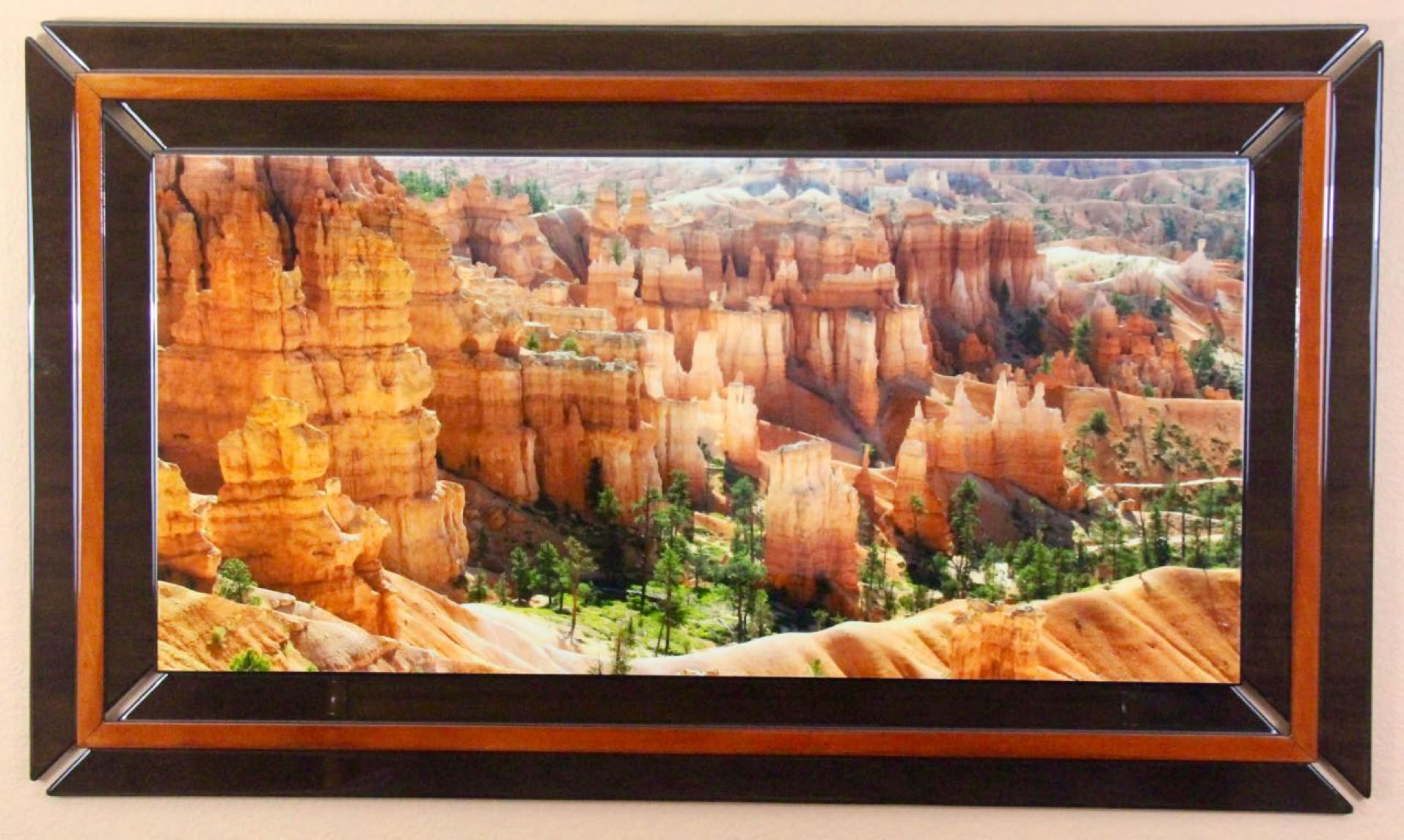 I took the photograph on the Eckles Brothers Hike of Zion, Bryce and the Grand Canyon. Colleen and I saw John Colella’s work at the Phoenix House and Garden show and ordered a custom frame. John coached me through getting the photograph enlarged and printed. I sent it to him and he created the piece of art with many coats of lacquer and skill.