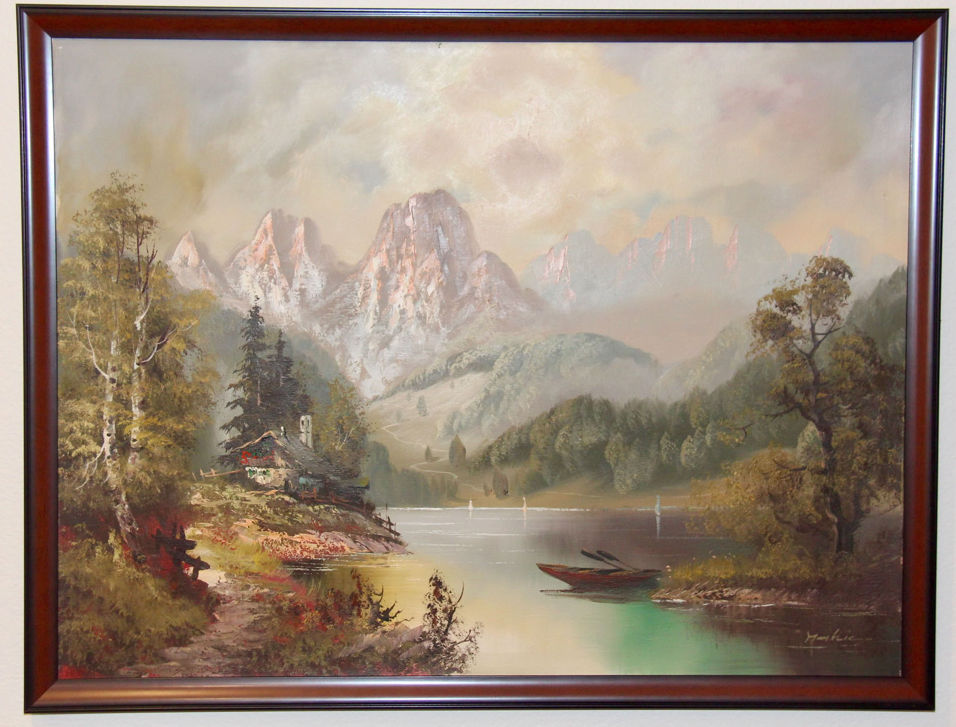 The signature looks like “Mayklic.” Eleanor bought the painting from a man in Germany selling them door-to-door in roughly 1973. The frame was fell apart last year when Eleanor gave it to Mary Kate, so she removed the frame and hung the painting without it. Recently we had it framed again