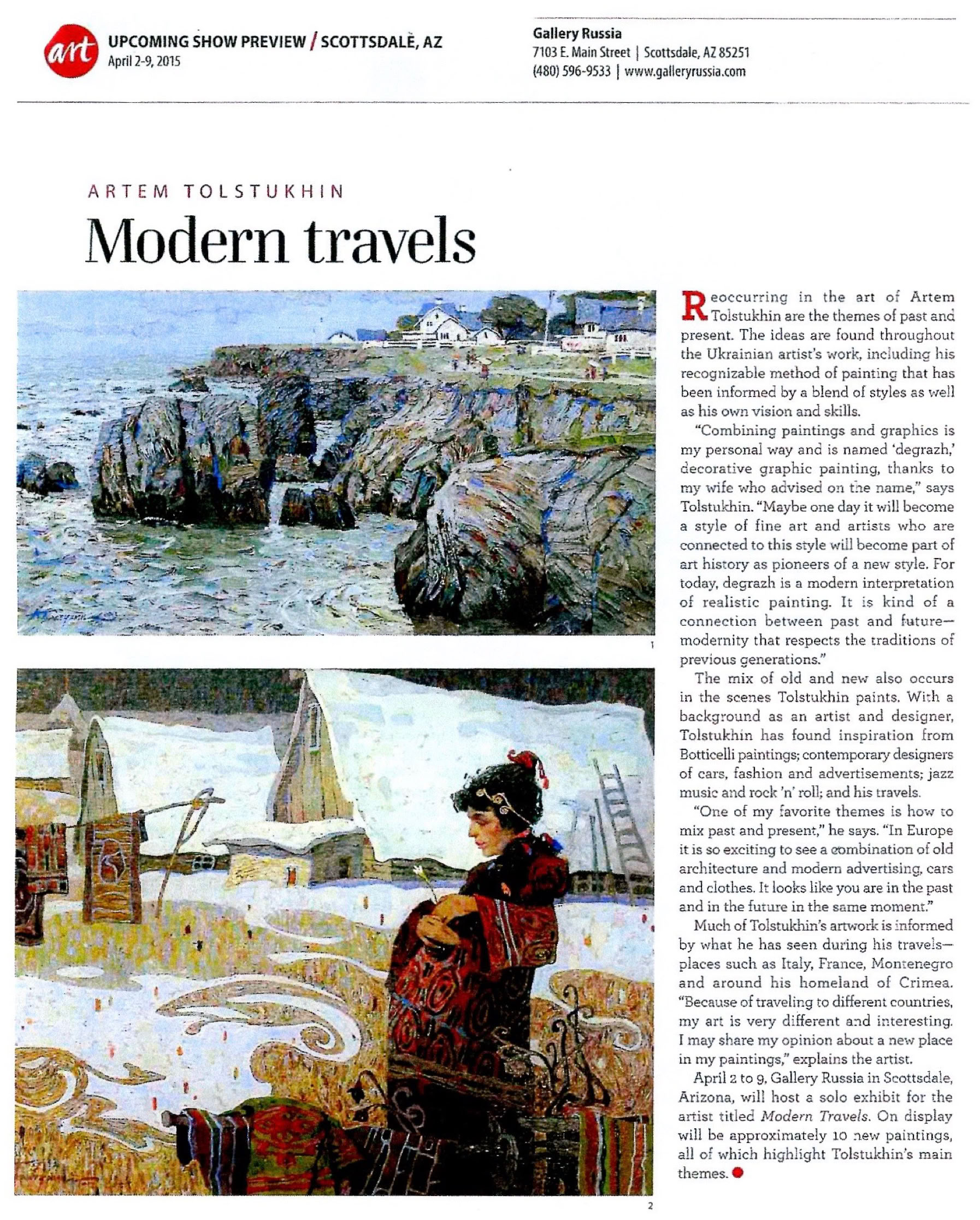 He has participated in multiple Ukrainian exhibitions of young artists including The Exhibition of Young Kharkov Artists" in Gallery Maestro in 2011. In 2015, he was honored with a one man exhibition at The Kharkov Art Museum- "Wind Rose." This exhibition showed 38 paintings from his travels to France, ltaly, Montenegro and Crimea and ran from April 26 to May 10. Four works were purchased by The Museum for its permanent collection. Artems works can be found in private coIIections within Ukraine, Russia, Germany, France and the United States. Of Iate, The talented young artist has become a favorite of Chinese collectors. His popularity is soaring among collectors from throughout the world. He has made a series of murals and participated in The restoration of several churches in Ukraine and Russia.