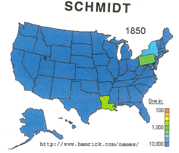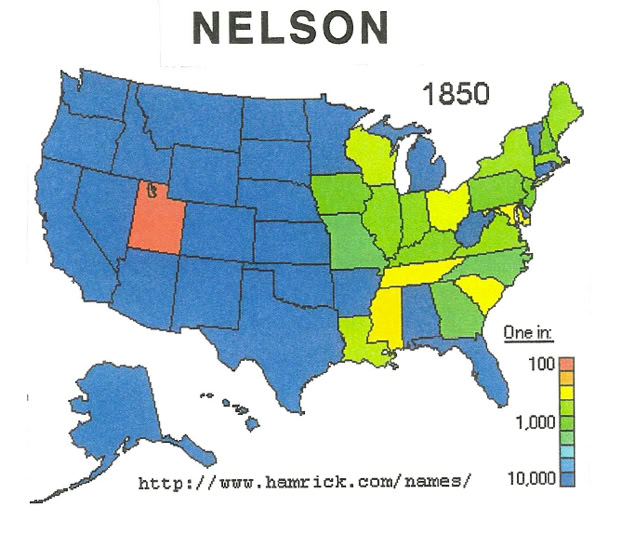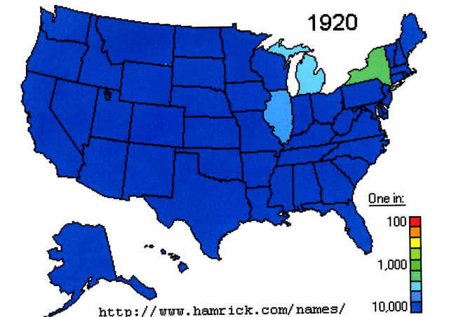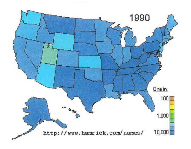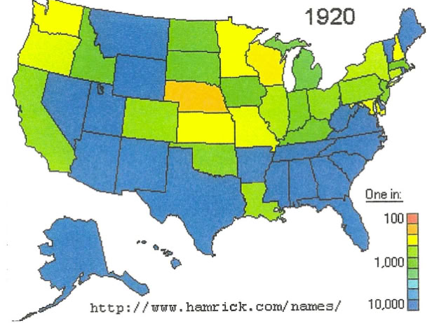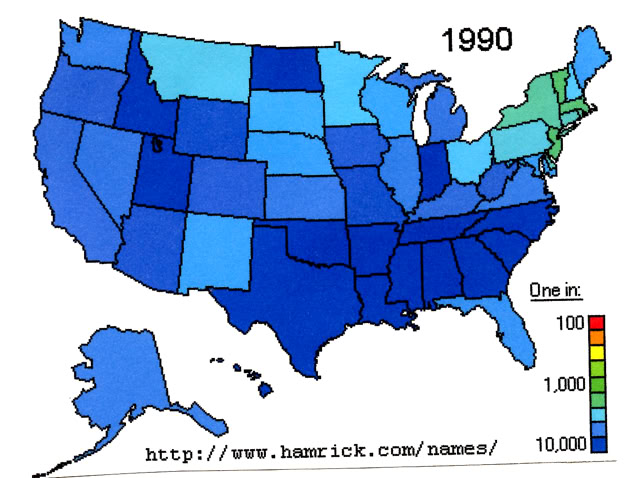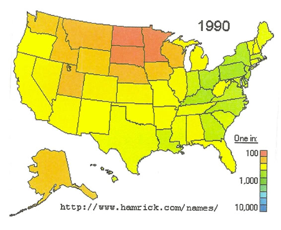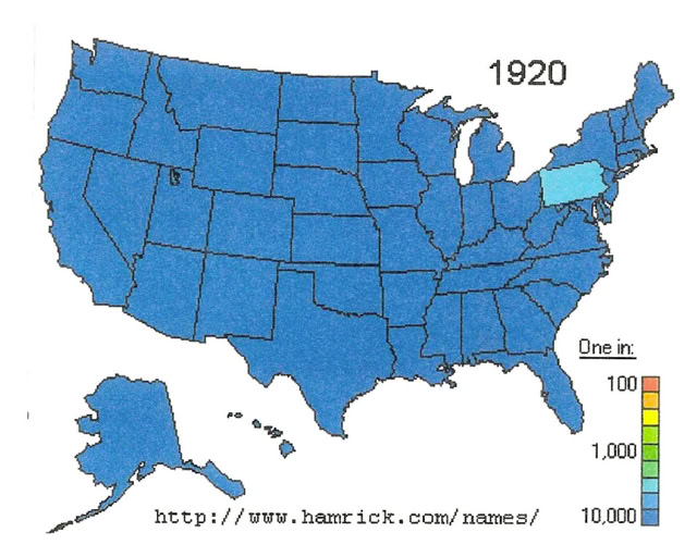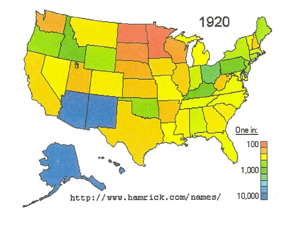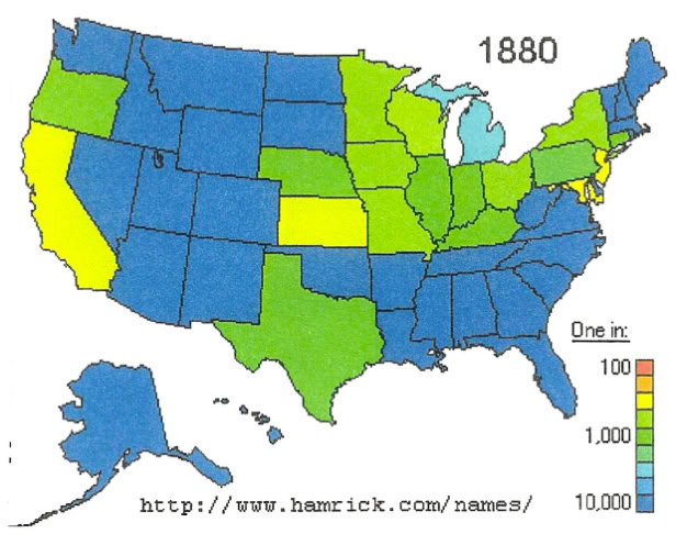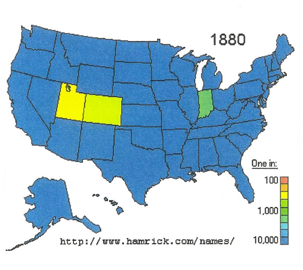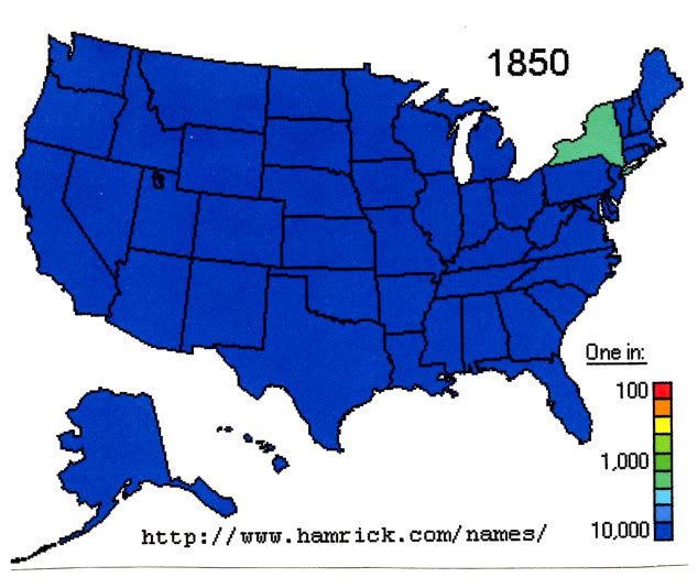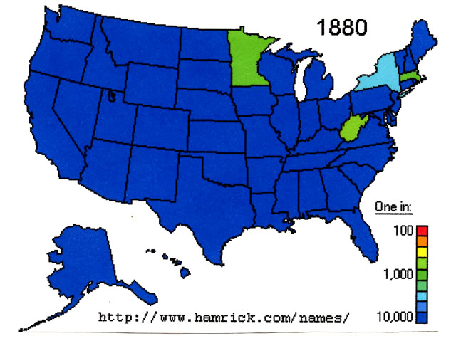 The United States maps below show the distribution a specific surname within the 50 United States. Our database contains the 50,000 most commonly occurring names in the United States. The source of this data is the 1850 Census, 1880 Census, 1920 Census, and 1990's phone books. Note that the Census data is a sampling of 1 in 100 names, so the 1990 data is the most