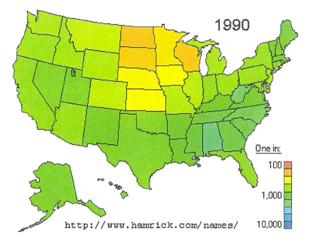accurate. The color of each state indicates how frequently you will find someone with this surname in each state. For instance, if a state is colored red, then 1 in 100 people (or more) in that state have the surname. Similarly, yellow means approximately 1 in 300 have the surname, green means 1 in 1000, and blue means 1 in 10,000 (or less).