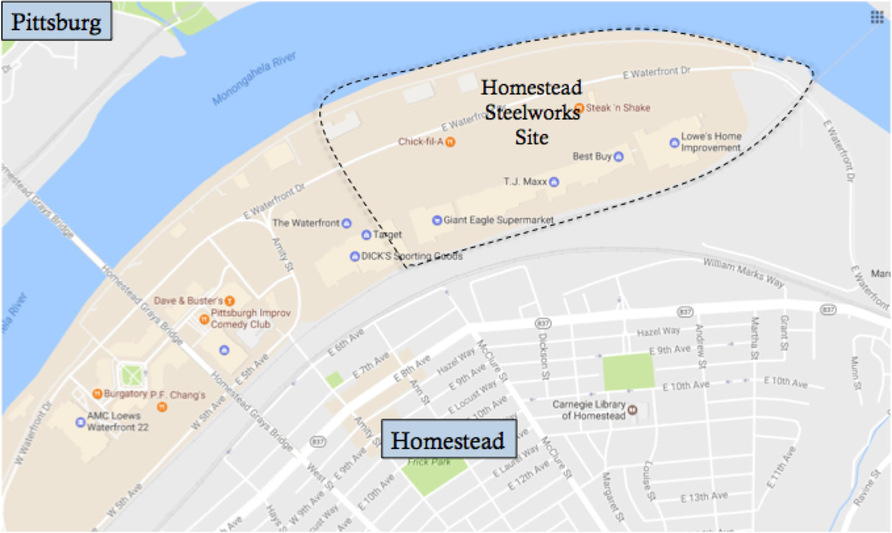 The Homestead Works closed in 1986 and its buildings were torn down in 1993–94. Homestead’s economy is now based on service industries and light manufacturing. The Waterfront shopping area was build on top of the Homestead Steel Works Site because of its central location in the Pittsburg metropolitan area.