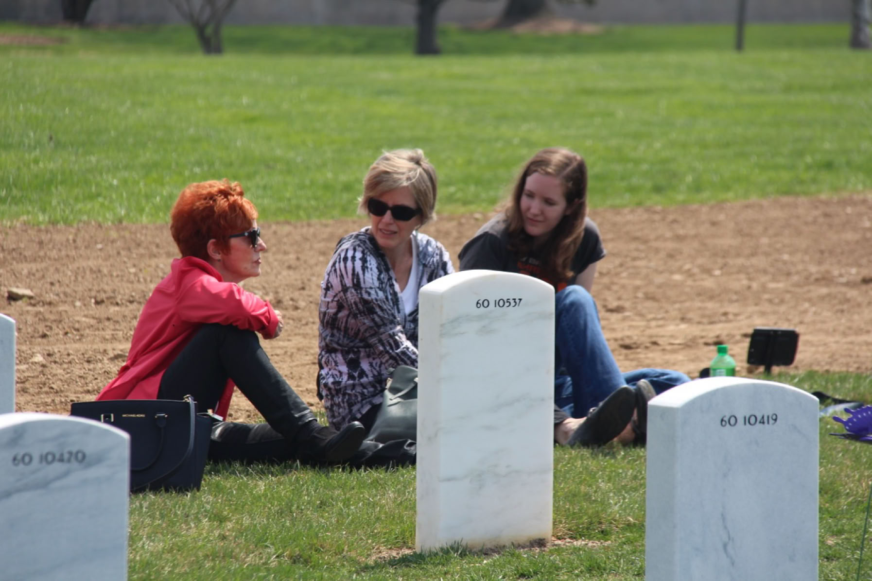 Eleanor Gilligan and Colleen and Mary Kate Eckles sitting at Lt Col Joseph Gilligan’s site
